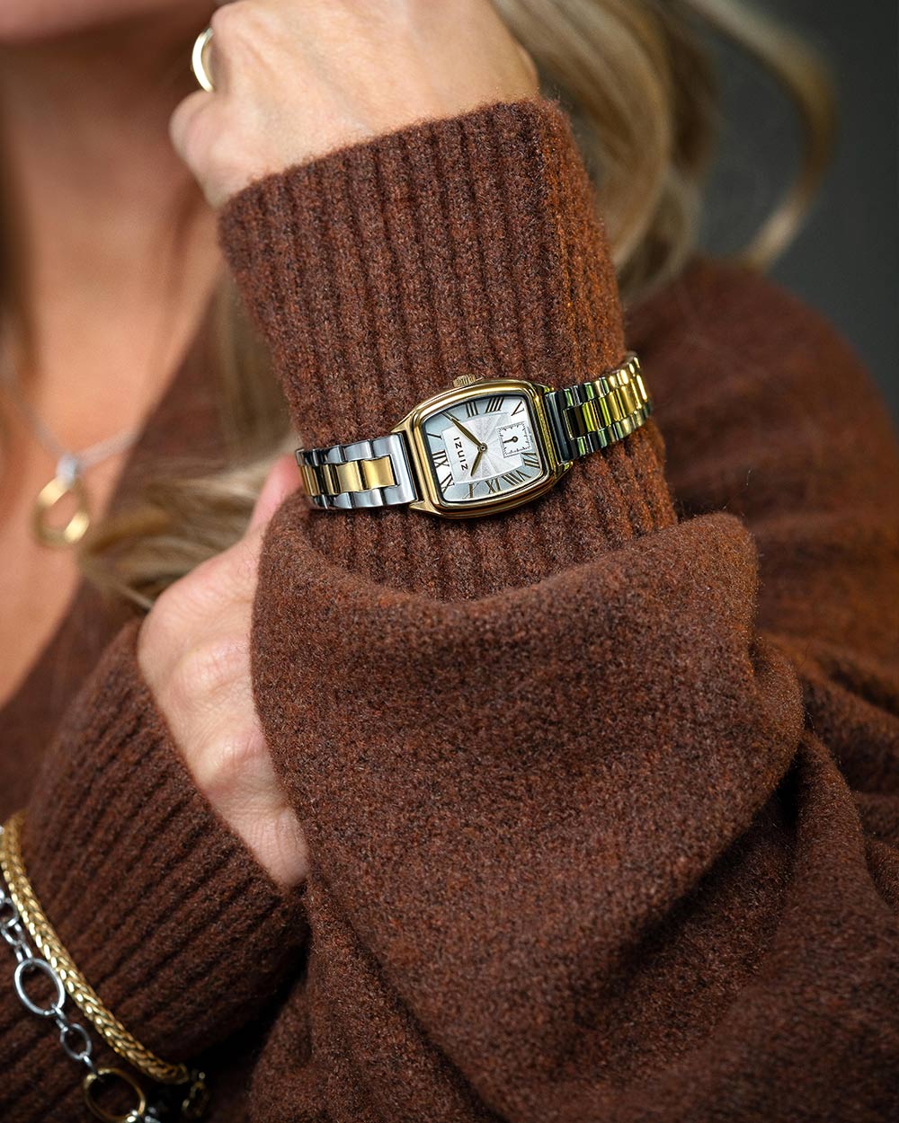 ZINZI Small Elegance bicolor horloge zilverkleurige sunray wijzerplaat en rechthoekige kast stalen bicolor schakelband 22mm extra dun ZIW2833