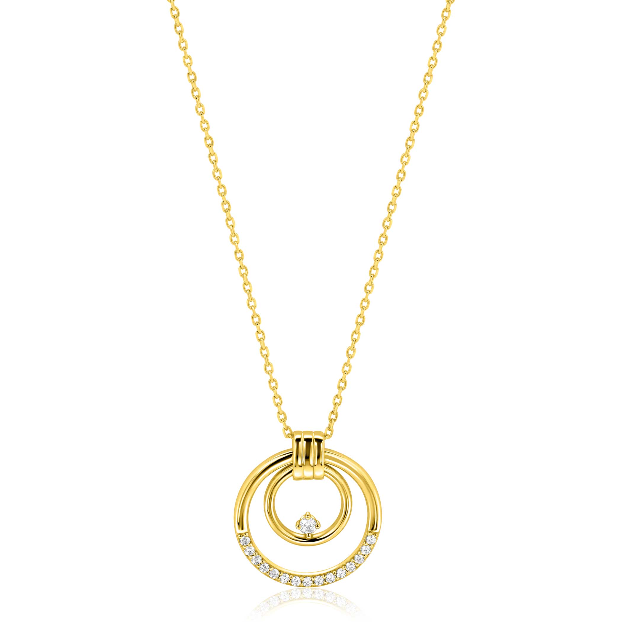 ZINZI goldplated zilveren ketting 45cm met elegante dubbele ronde hanger (24mm) speels bezet met witte zirkonia's ZIC2819